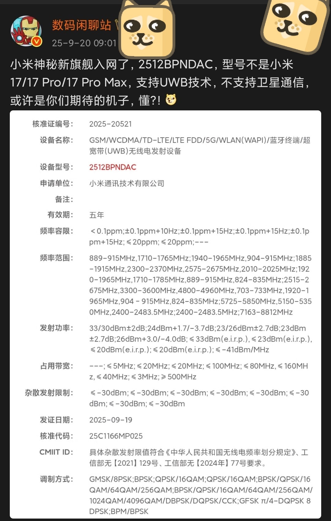 由数码闲聊站爆料,小米一款型号为2512BPNDAC的神秘新手机突然入网,不是之前的小米17系列,支持UWB技术、无卫星通信,充满悬念。